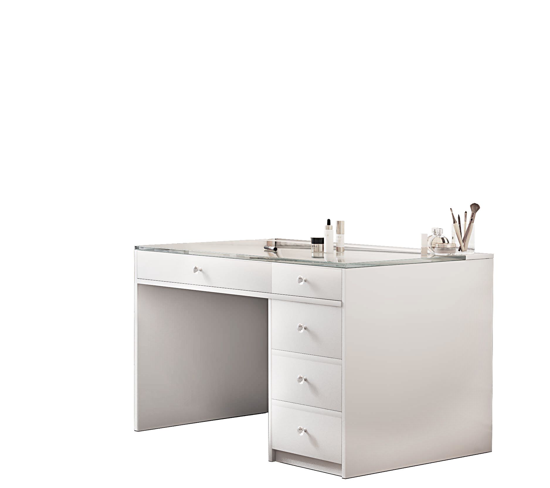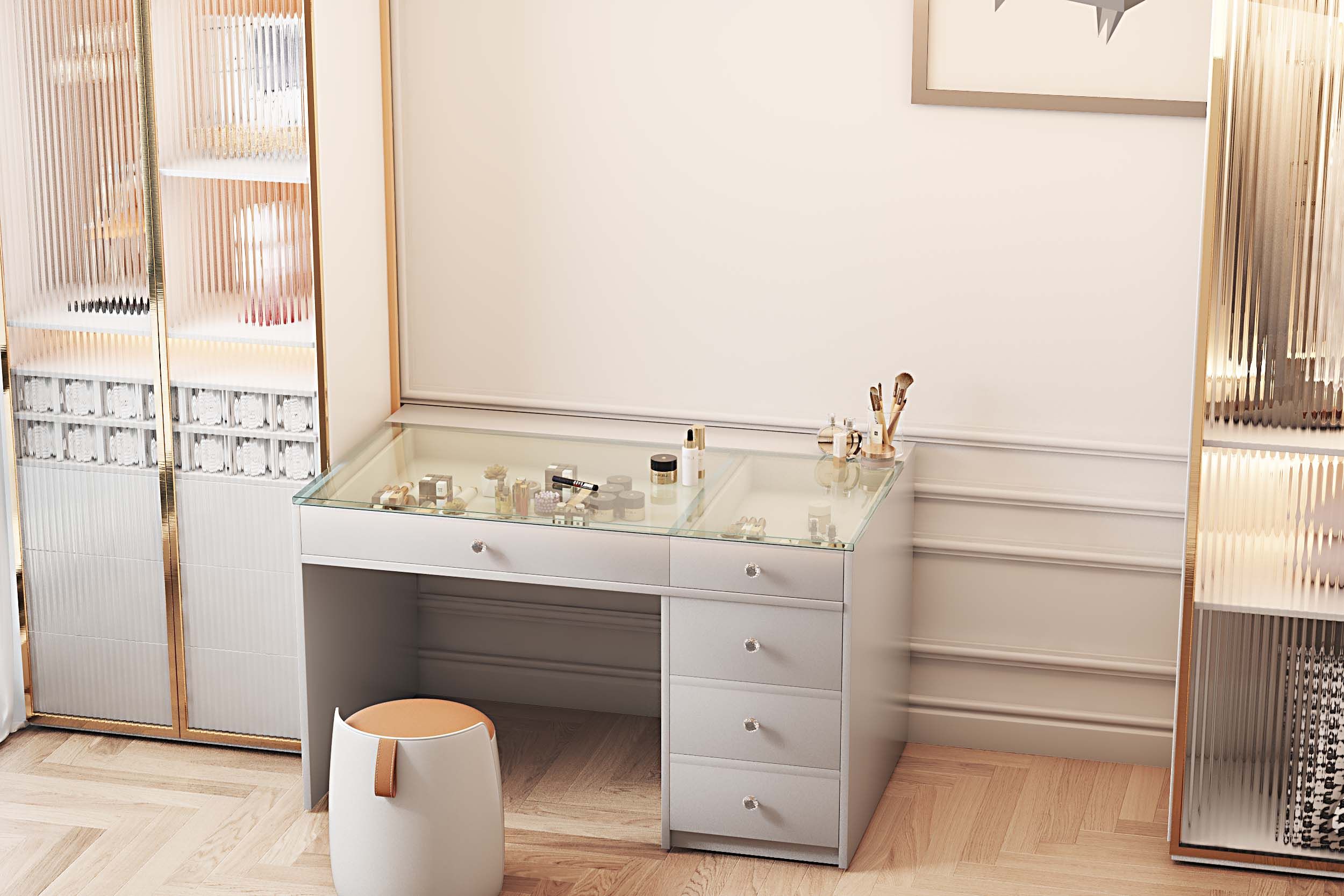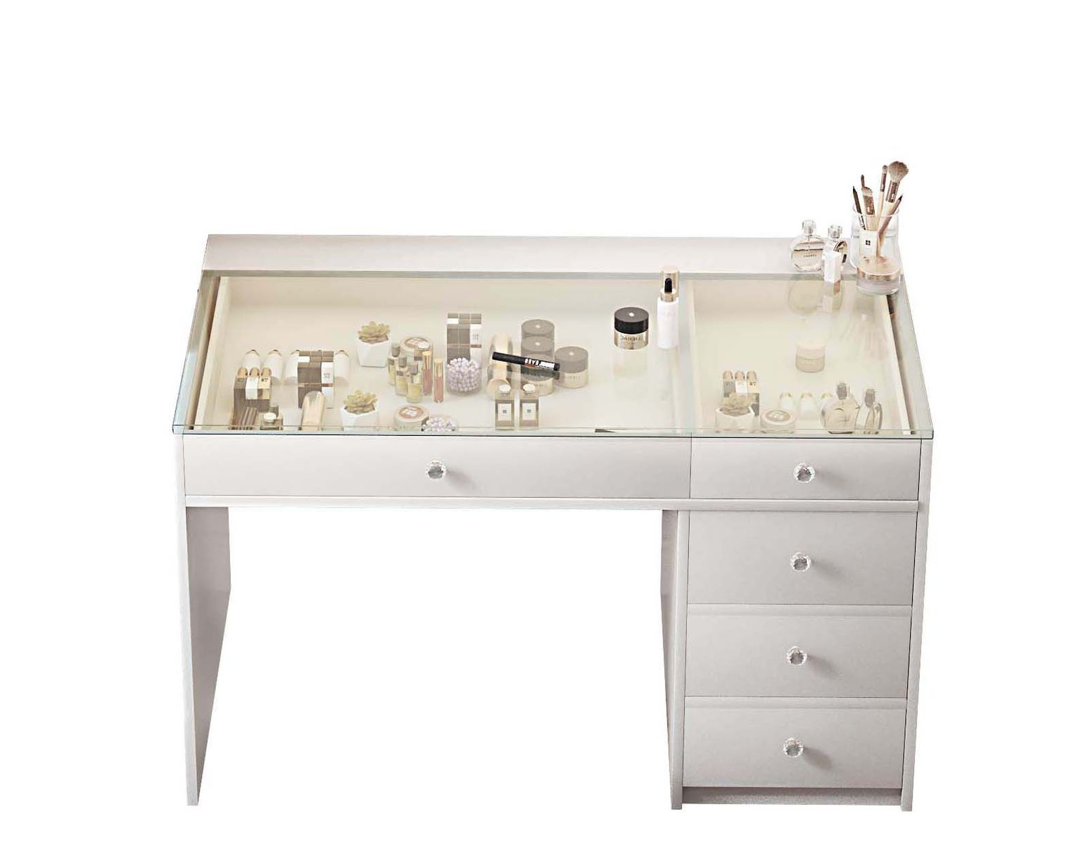 The Abigail Vanity Table Base comes with 3 deep drawers as well as two top drawers which are see through from the glass top. The large center drawer is plenty of space for all your needs.