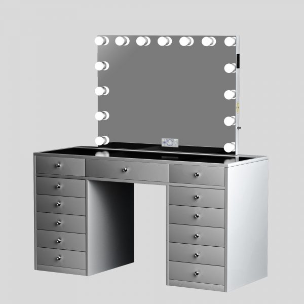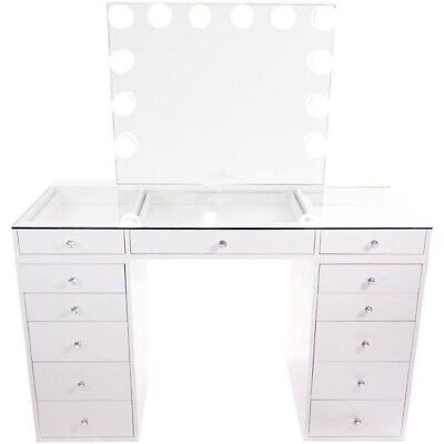 The Valentine I vanity base (White) with matching Hollywood Mirror is perfect for any room and any space. It provides a beautiful Large mirror with lightbulbs (brightness that can be adjusted), LED control panel which shows the date and time, as well as bluetooth connectivity with two side speakers! The Vanity table comes with 13 drawers which provides plenty of storage for all your needs as well as a see through glass top! This beautiful package comes with it all!