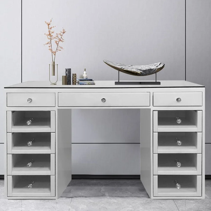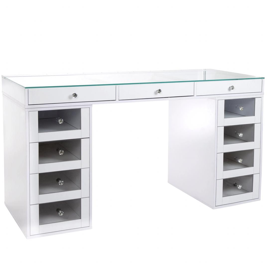 The Athena Vanity Table Base comes with 8 See through drawers which provides a clean look in any space, 3 additional top drawers, and a see through glass top.