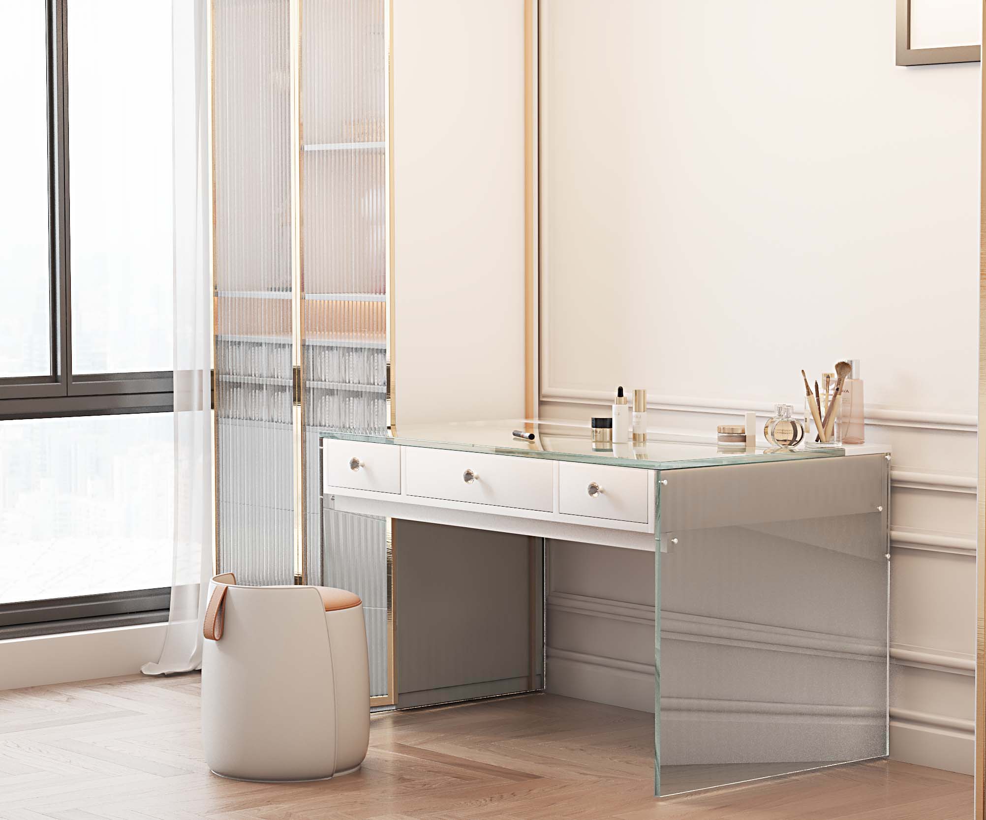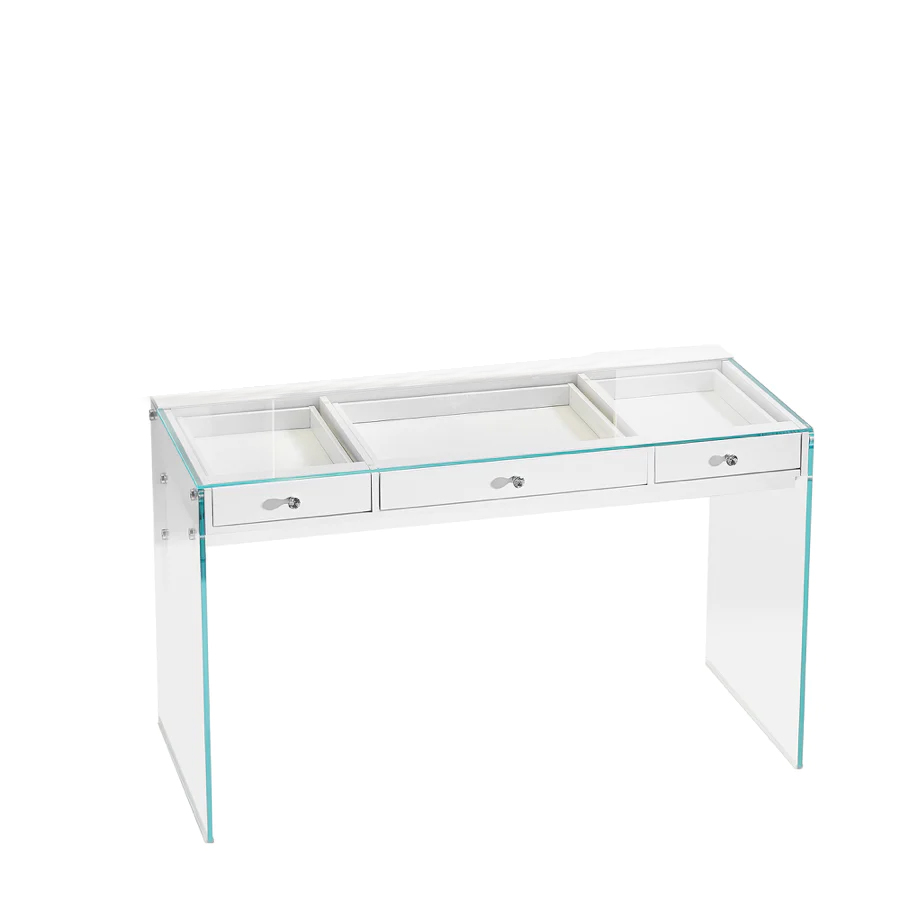 The beautiful Halo Vanity base provides a clean and slick look. This unique Vanity Base comes with glass legs to provide that clean look, and three spacious drawers that provide enough space for all your beauty products. The glass top finished the beautiful look this vanity provides.
